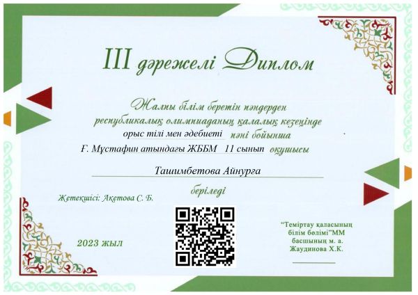 3. Утешова Аружан Муратовна 11 «А» сынып оқушысы – 3 орын – Қазақстан тарихы пәні бойынша – жетекшісі – Балгабаев Ойрат Муратович