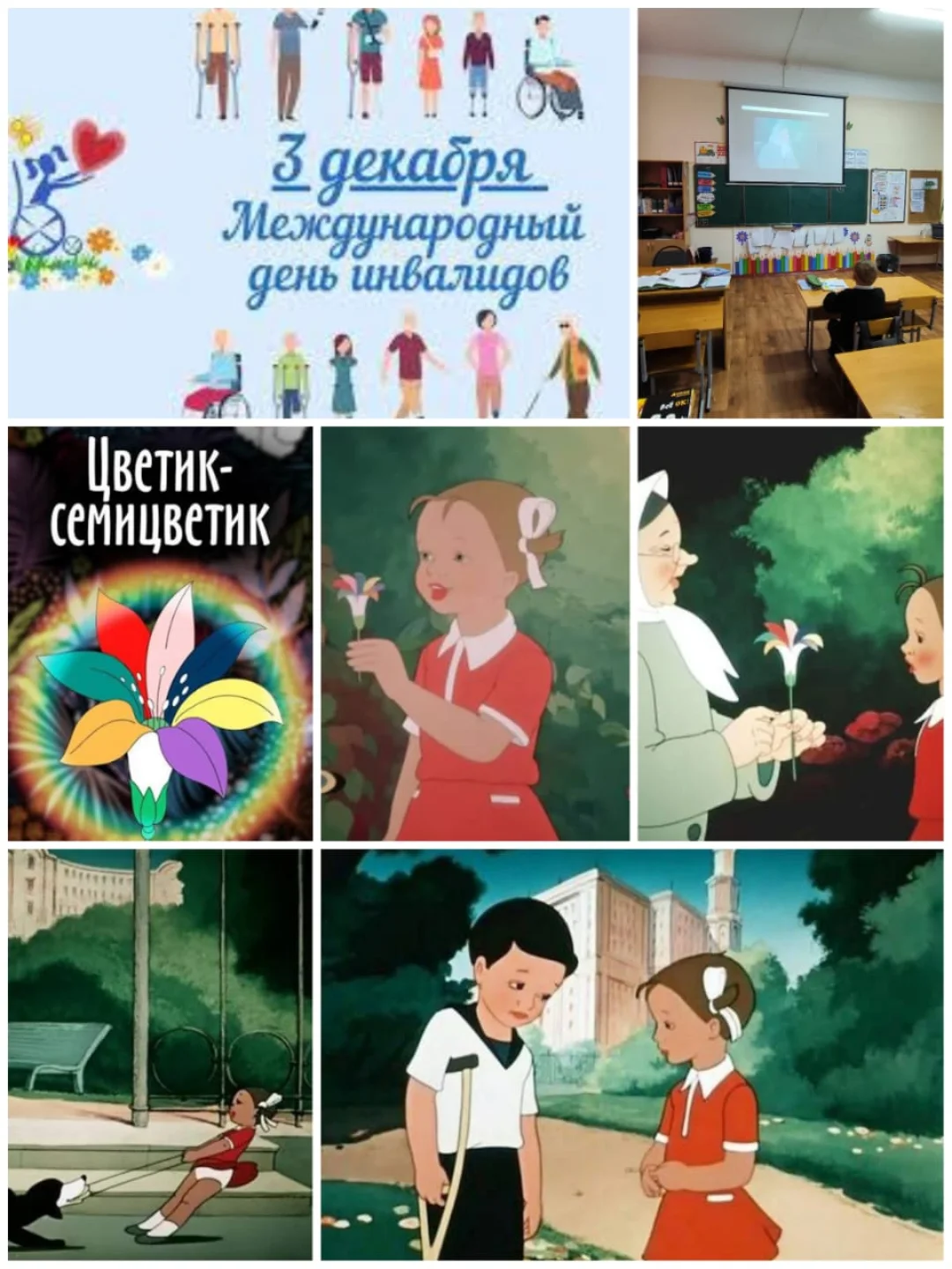В рамках Всемирного дня инвалида в 3 "Б" классе было проведено тематическое мероприятие. Ребята посмотрели добрый и поучительный мультфильм «Цветик-семицветик», раскрывающий важные темы доброты, сочувствия и готовности прийти на помощь тем, кто в этом нуждается.