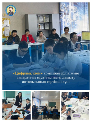 Қарағанды облысының білім беруді дамыту орталығының ұйымдастыруымен Ә.Бөкейханов атындағы мектеп-лицейінде 2023 жылдың 9 ақпан күні "Цифрлық әлем" компьютерлік және ақпараттық сауаттылықты дамыту апталығының 4-күні 8«В» сыныбында «While циклі» тақырыбында Есмаганбетова Н.С., 10А-сыныбында HTML мәтінді форматтау Сейтпанова Н.М., 4Б сыныбында «Презентацияға арналған ақпарат» тақырыбтарында Қайдарова А.А., ашық сабақ өткізді. Мақсаты: Оқушылардың цифрлық сауаттылығын арттыру; Информатика пәніне деген қызығушылығын қалыптастыру; Оқушыларға топпен жұмыс жасауда бір-бірін сыйлауға тәрбиелеу.