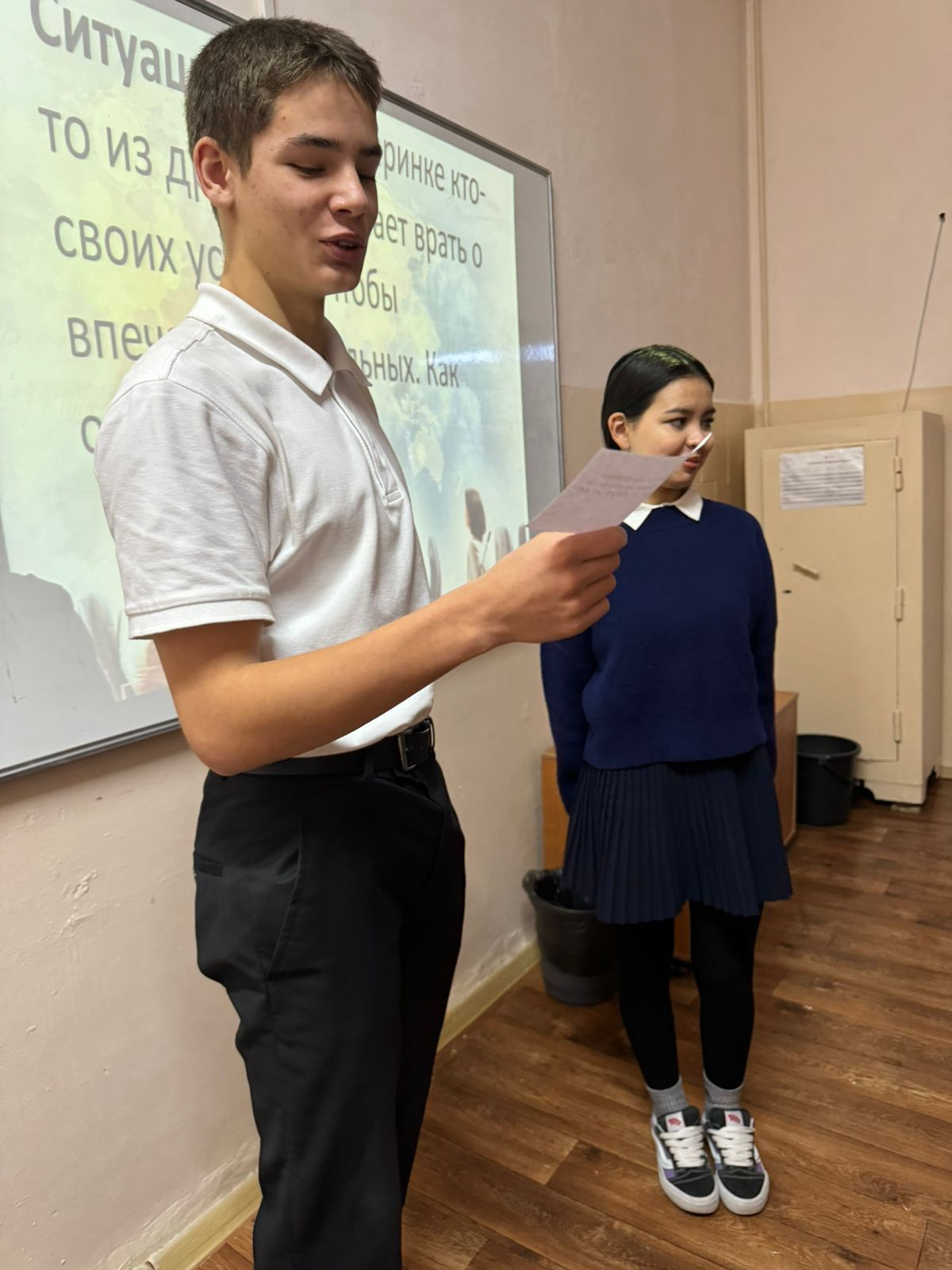 "Этика және адалдық: неліктен лайықты болу маңызды"тақырыбындағы сынып сағаты. Сынып сағаты барысында балалар әр адамның өміріндегі адалдық пен адалдықтың маңыздылығын талқылады. Басқалармен қарым-қатынаста моральдық принциптерді сақтаудың маңыздылығы және бұл қасиеттер жеке даму мен қоғамдағы сенімге қалай әсер ететіні туралы айтылды. Оқушылар тіпті қиын жағдайларда да адал болу қаншалықты маңызды екенін талқылады, шындық пен өтірік арасындағы таңдауды қамтитын әртүрлі өмірлік жағдайлардан шығудың жолын тапты. Сынып сағаты оқушыларға этикалық нормалардың қаншалықты маңызды екенін және неге лайықты адам болу кез келген қарым — қатынаста құрмет пен сенімнің кепілі екенін түсінуге көмектесті.