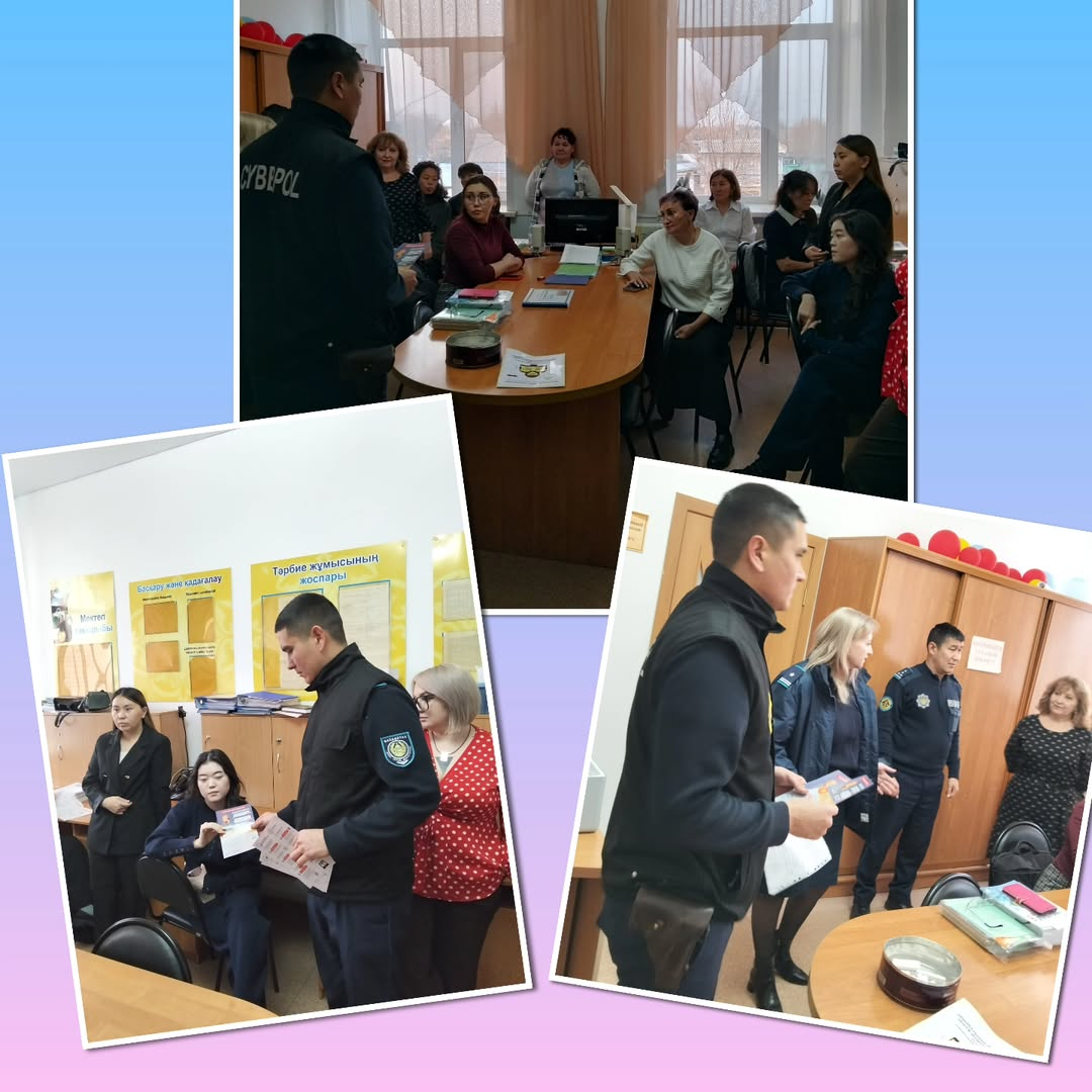 "Нұркен Әбдіров атындағы ТМ (РО)" КММ-де мектеп қызметкерлерінің полиция қызметкерлерімен кездесуі өтті, оның барысында құқық қорғау органдарының өкілдері заманауи алаяқтық түрлері, оны тану тәсілдері және жеке қауіпсіздік шаралары туралы түсіндірме әңгіме өткізді.
