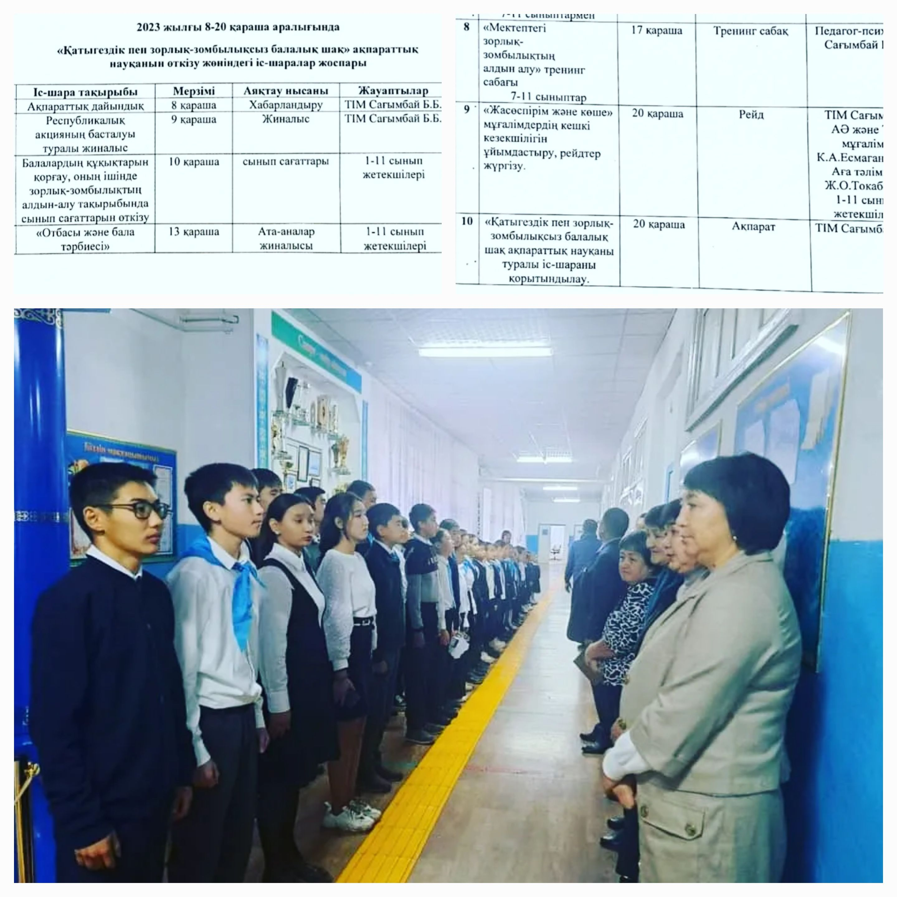 Жараспай ЖББ мектебінде 2023 жылдың 8 қараша күні мектепшілік саптық жиында "Қатыгездік пен зорлық-зомбылықсыз балалық шақ" ақпараттық науқаны басталғаны туралы іс-шаралар жоспары таныстырылды.