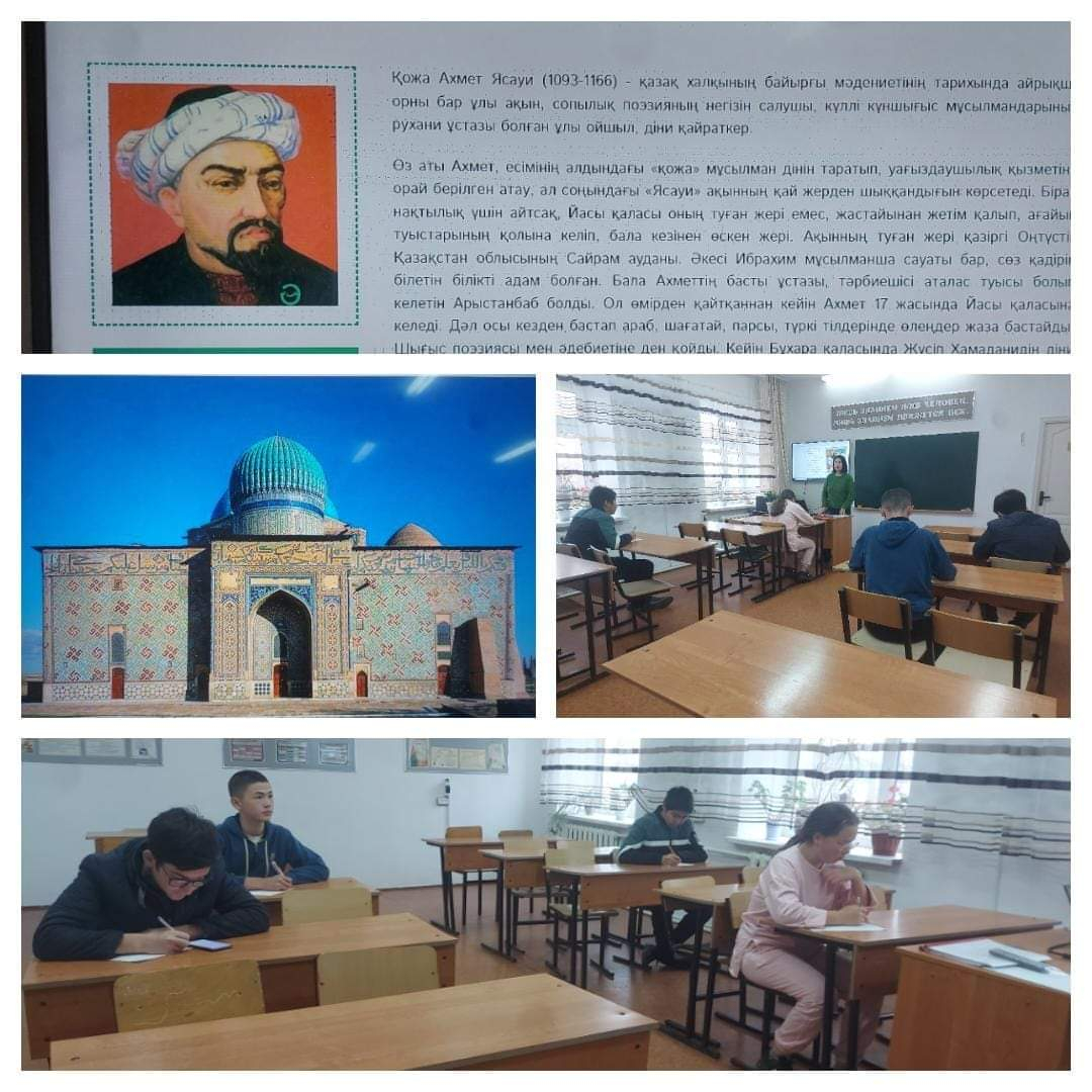 Күзгі каникул іс-шаралар жоспары бойынша мектебіміздің тарих пәнінің мұғалімі Н. Исжанова "Қожа Ахмет Яссауидің хәл хикмет ілімі" тақырыбы бойынша балаларға мағлұмат беріп, эссе жазуға тапсырма берілді.
