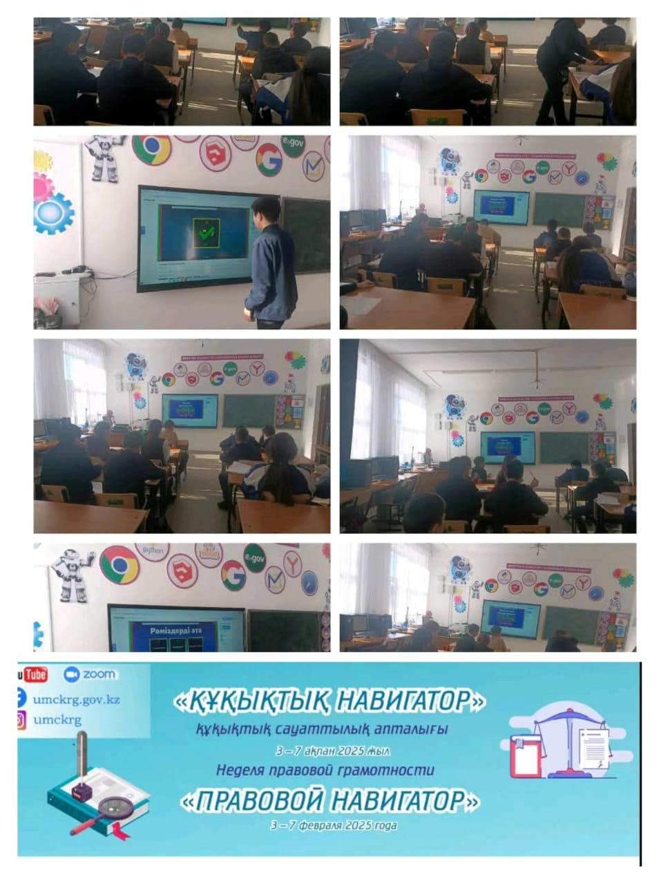 'Құқықтық навигатор" құқықтық сауаттылық апталығы аясында "Қазақстан республикасының мемлекеттік рәміздері" тақырыбында 7 сынып оқушылары тест тапсырды.