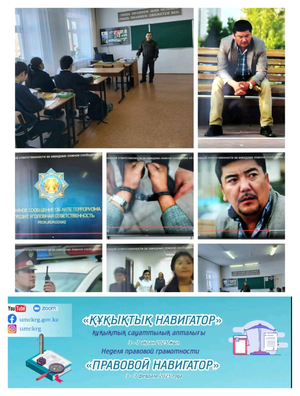'Құқықтық навигатор" құқықтық сауаттылық апталығының жоспарына сәйкес "Кәмелетке толмағандардың мектептегі лаңкестік әрекеттері және көрінеу жалған хабарламалары үшін жауапкершілігі» атты тақырыпта түсіндіру жұмыстары жүргізіліп, бейнеролик көрсетілімі ұйымдастырылды.