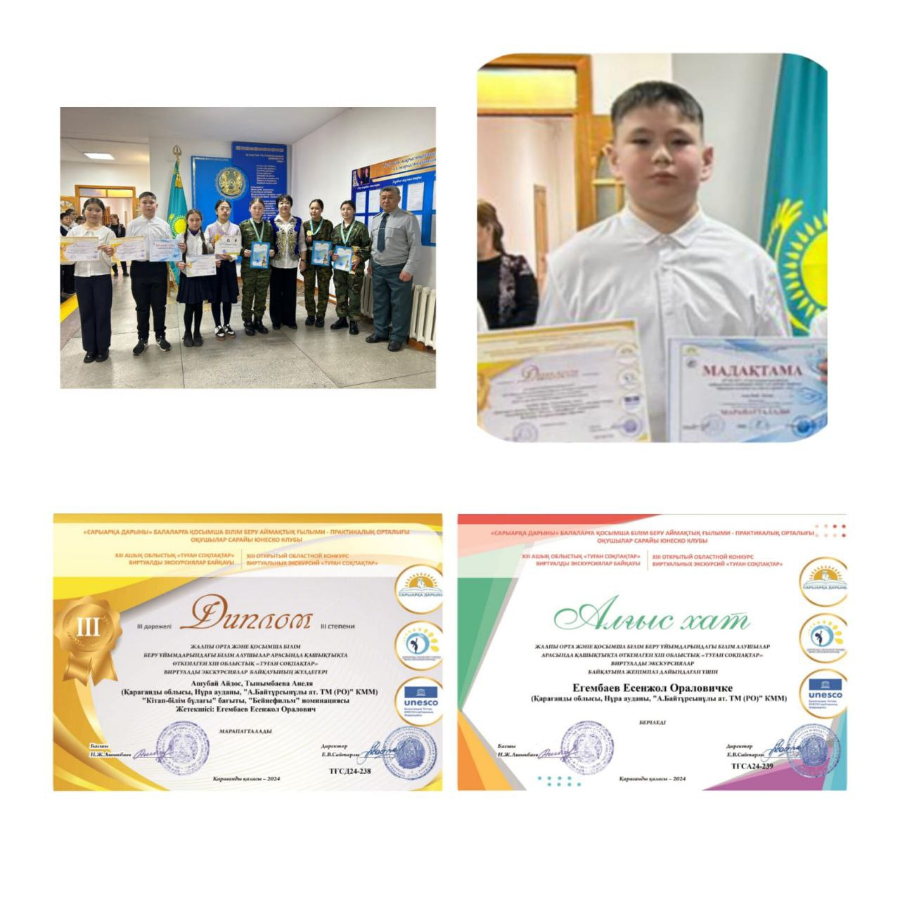Жалпы орта және қосымша білім беру ұйымдарындағы білім алушылар арасында қашықтықта өткізілген XIII облыстық "Туған Соқпақтар" виртуалды экскурсиялар байқауының жүлдегері "Кітап - білім бұлағы" бағыты "Бейнефильм" номинациясы бойынша "А. Байтұрсынұлы атындағы тірек мектебі (РО)"КММ 6-сынып оқушысы Тынымбаева Анель және Ашубай Айдос. Жетекшісі: Егембаев. Е. О.