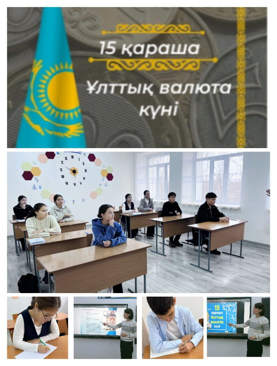 10 қараша күні 8,10 қазақ сыныптарымен 15-қараша Ұлттық валюта теңге күніне орай "Теңге- тәуелсіздіктің тірегі" - тақырыбында сынып сағаты өтті.Сонымен қатар қауіпсіздік сабақтары қамтылды.