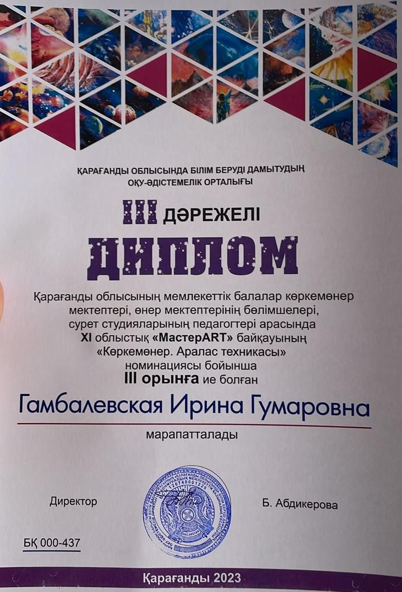Гамбалевская Ирина Гумаровна, педагог ДЮЦа «Жастар» приняла участие в вывставке-конкурсе с работой «Рождение новой звезды» и была награждена Дипломом III cтепени!