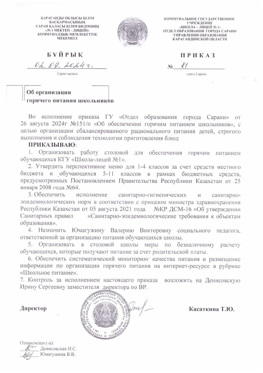 Об организации горячего питания школьников№81 от 02.09.2024 |