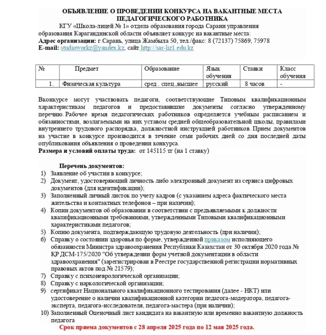 ОБЪЯВЛЕНИЕ О ПРОВЕДЕНИИ КОНКУРСА НА ВАКАНТНЫЕ МЕСТА ПЕДАГОГИЧЕСКОГО РАБОТНИКАСрок приема документов с 18 апреля 2025 года по 29 апреля 2025 года. |