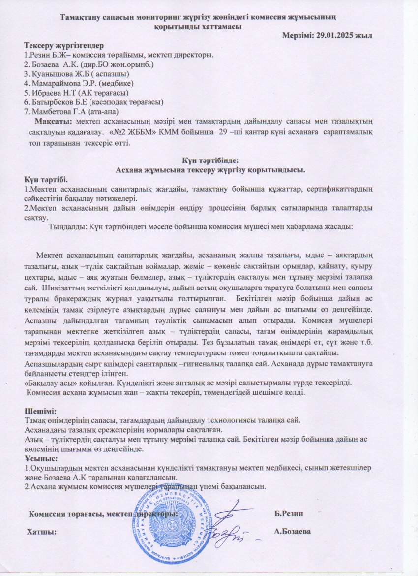 Тамақтану сапасын мониторинг жүргізу жөніндегі комиссия жұмысының қорытынды хаттамасы.