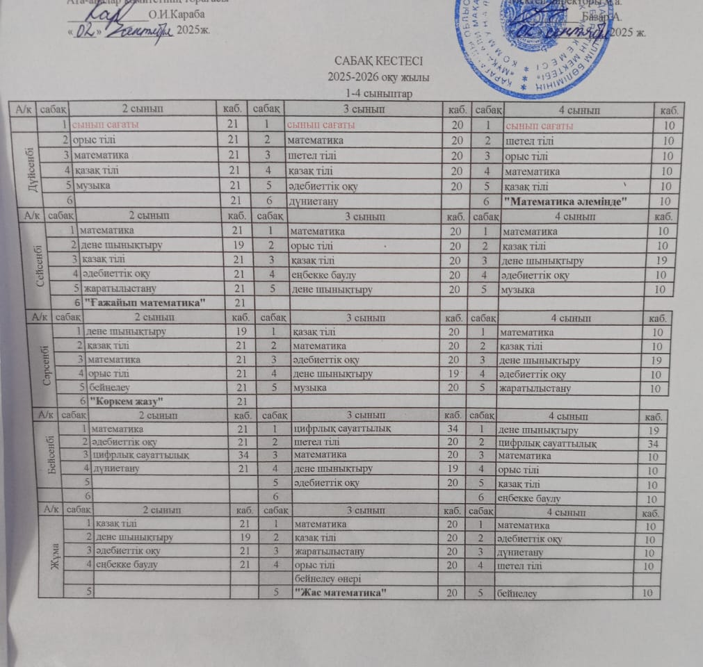 1-4 сыныптарға арналған сабақ кестесіУроки |