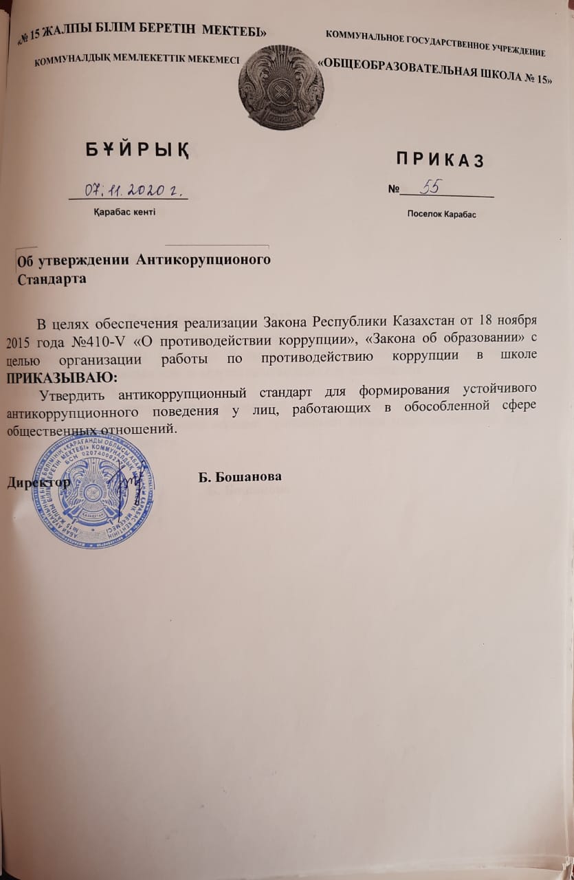 Приказ КГУ "Общеобразовательная школа № 15"Об утверждении Антикоррупционного Стандарта |
