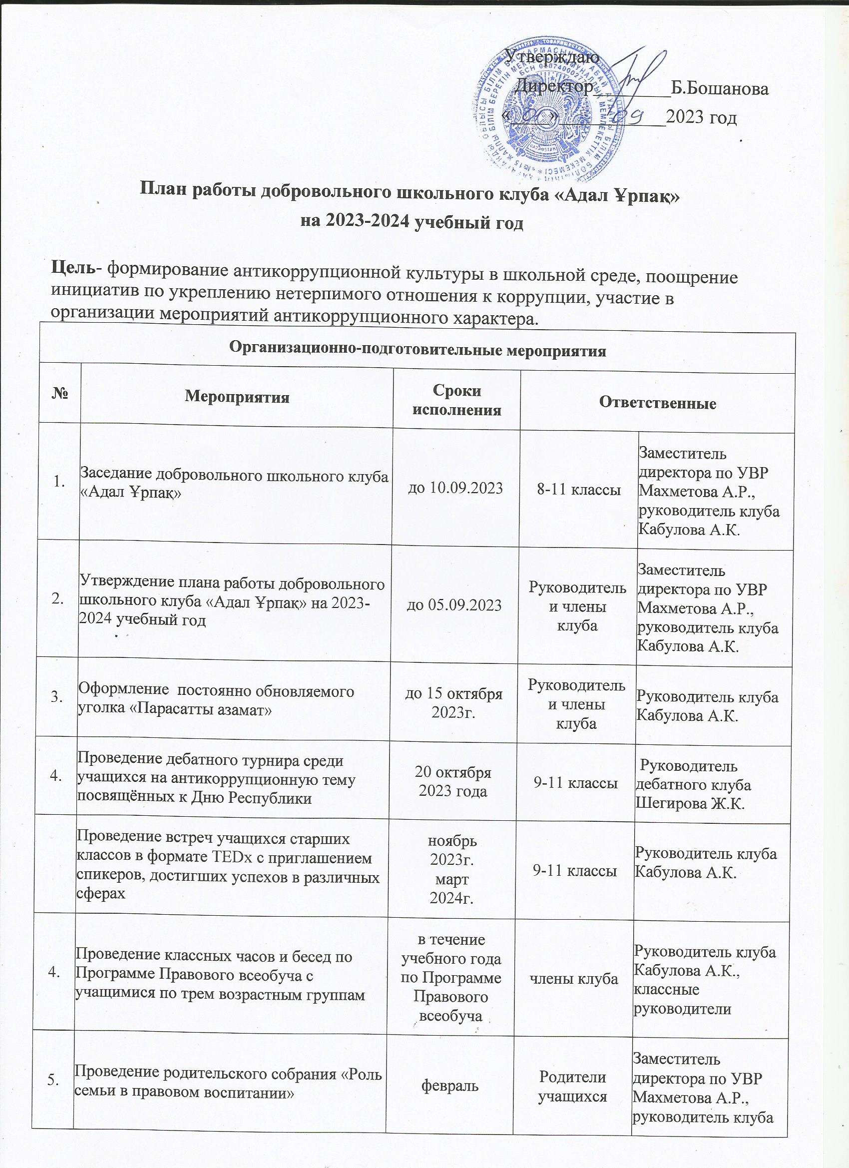 "Адал Ұрпақ" клубытың жоспары 2023-2024 оқу жылы"Адал Ұрпақ" еріктік мектеп клубытың жоспары 2023-2024 оқу жылы |