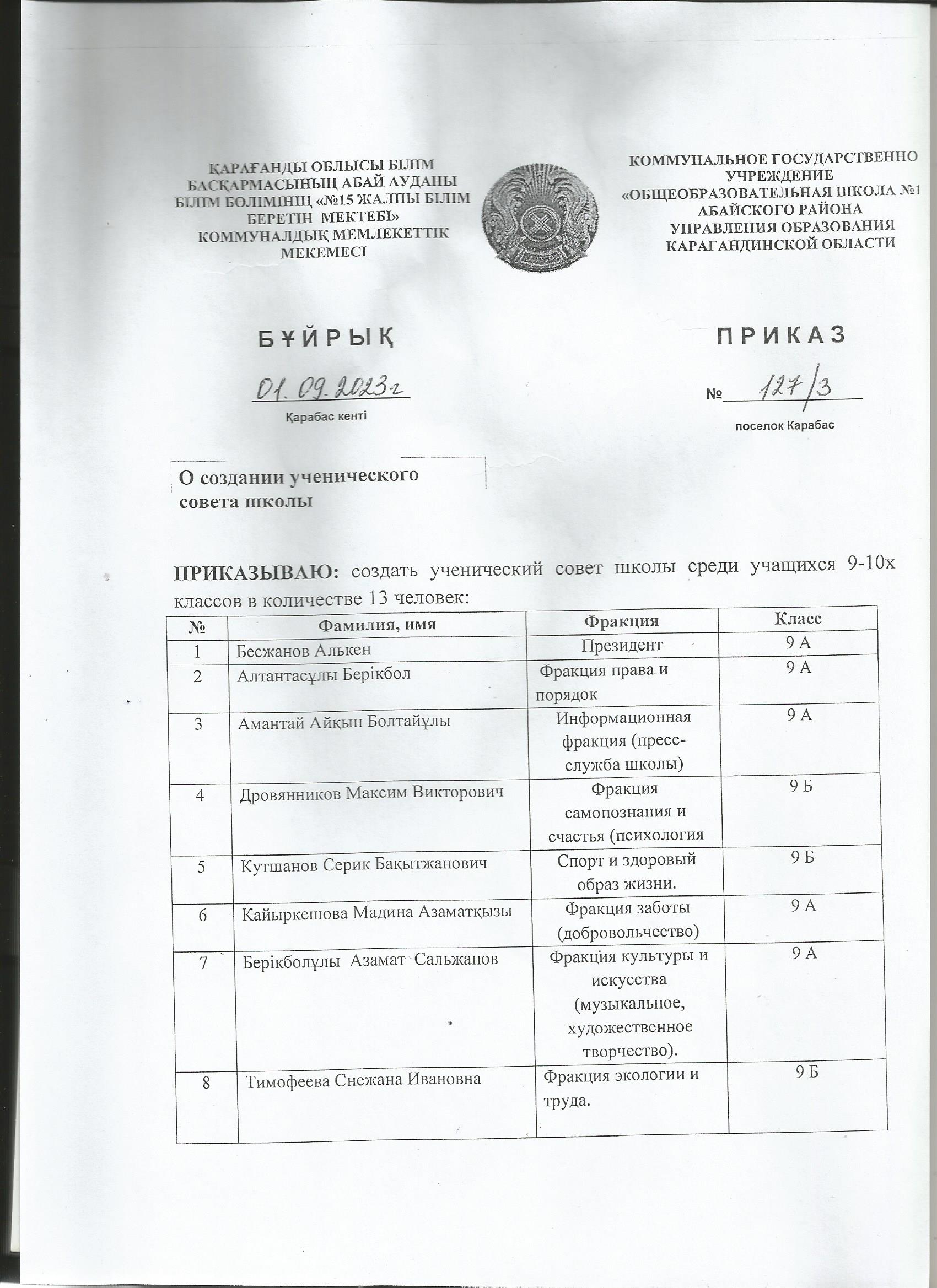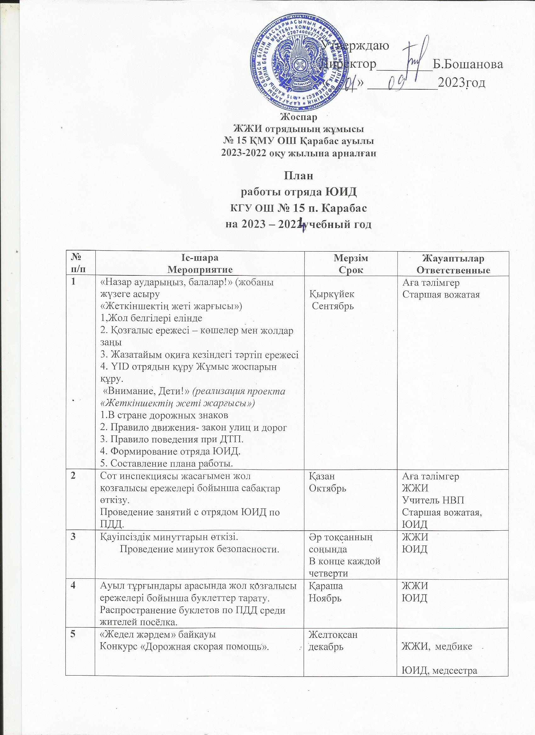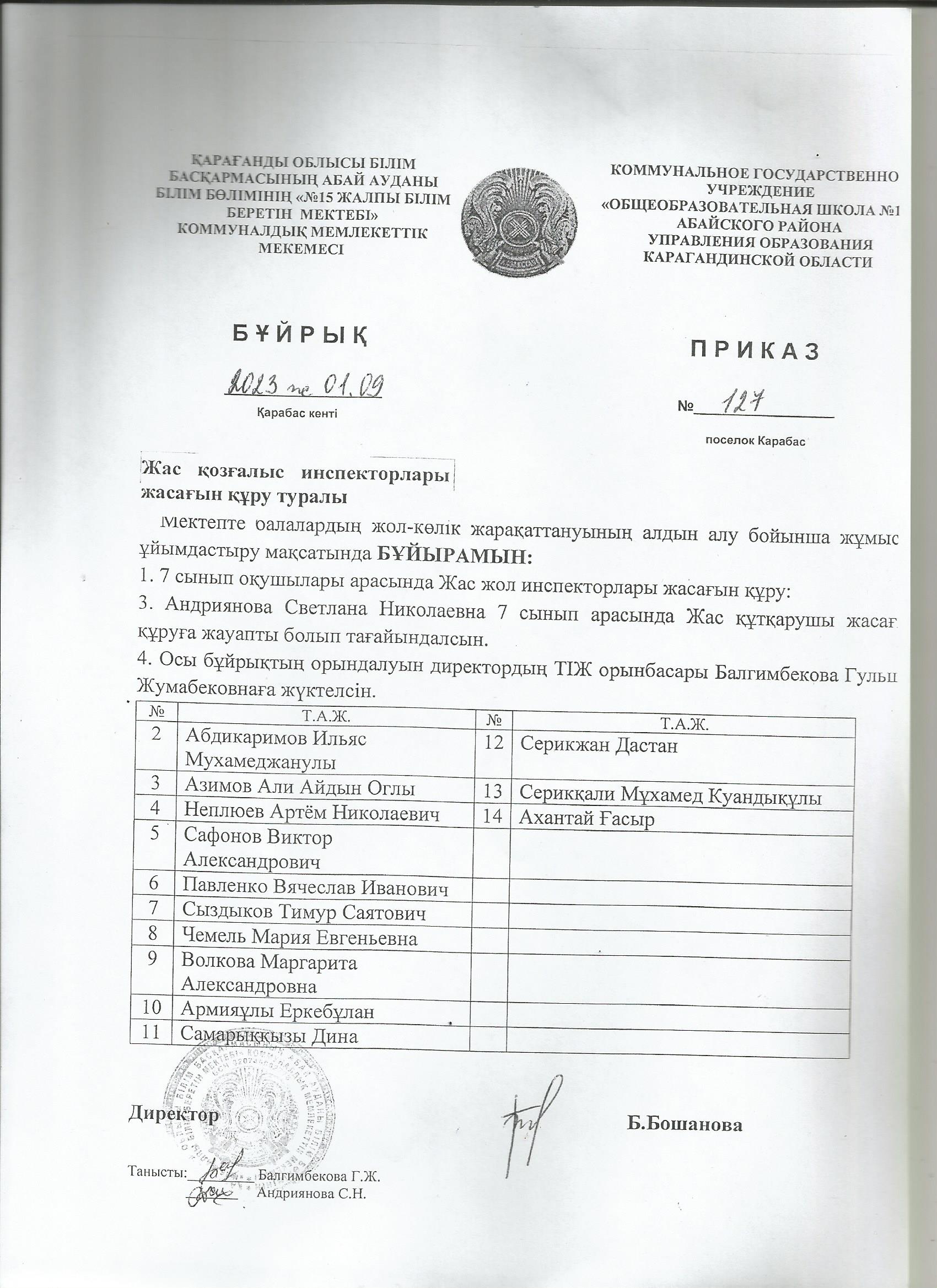 Бұйрық 2023-2024 жыл Жас қозғалыс инспекторлары жасагын құру туралы |