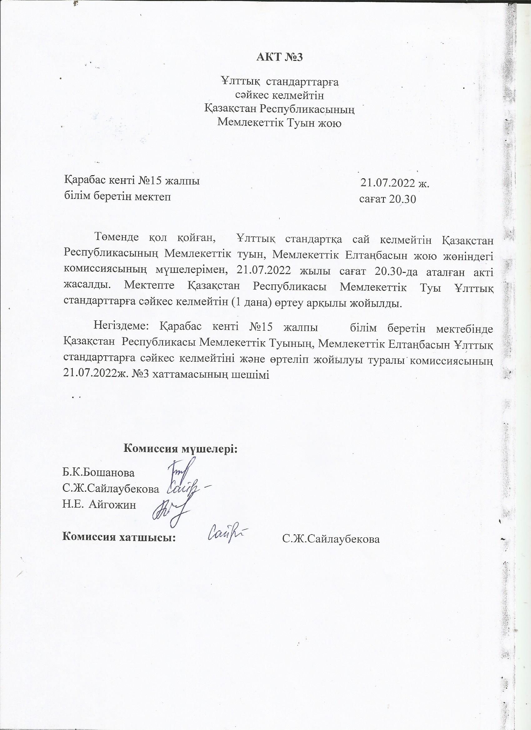 Ұлттық стандарттарға сәйкес келмейтін Қазақстан Республикасының Мемлекеттік Туын жоюАкт №3 |