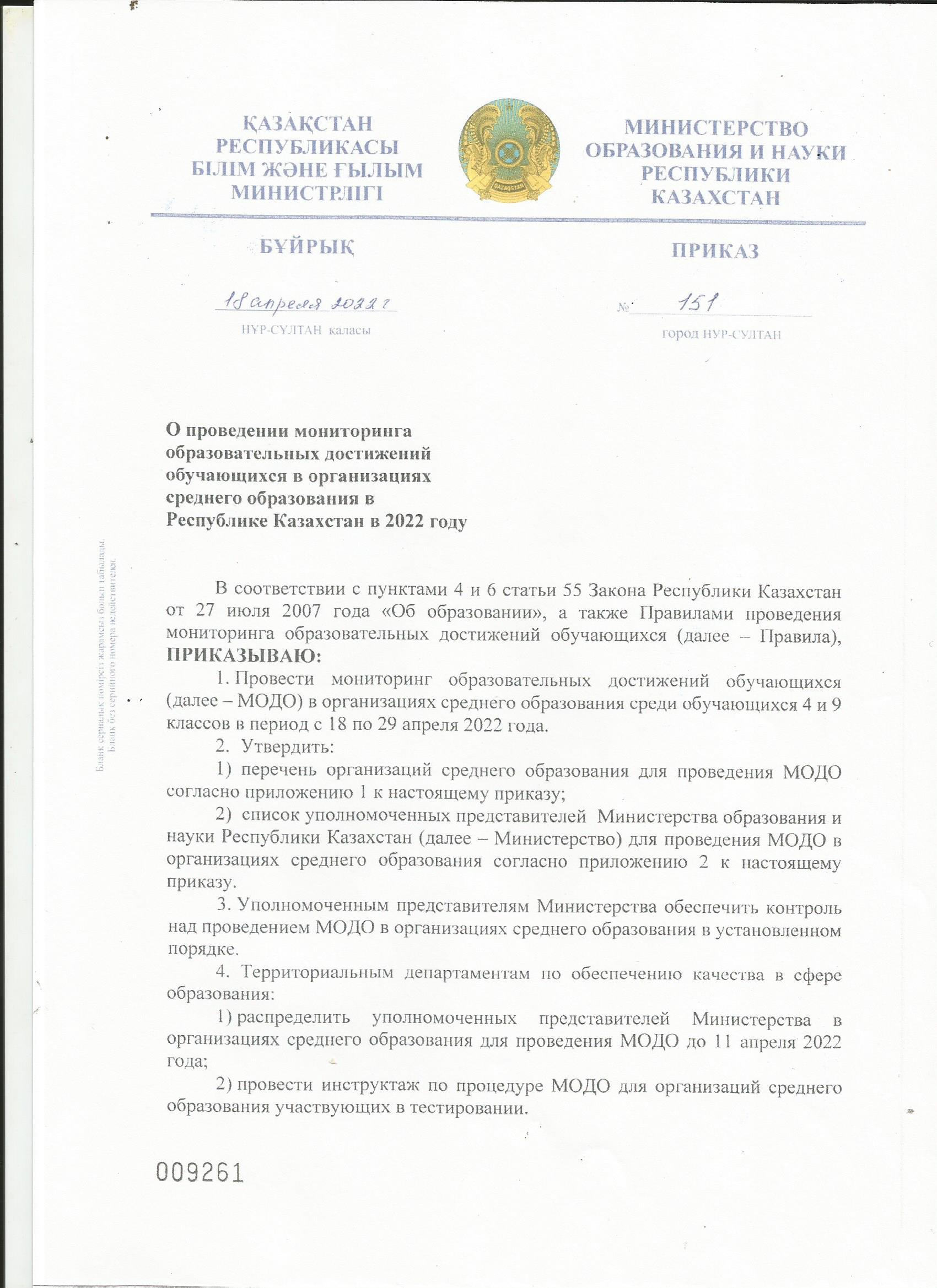 Приказ Министерства Образования и Науки Республики Казахстан № 151 от 18 апреля 2022 годаО проведении мониторинга образовательных достижений обучающихся в организациях среднего образования в Республике Казахстан в 2022 году стр.1 |