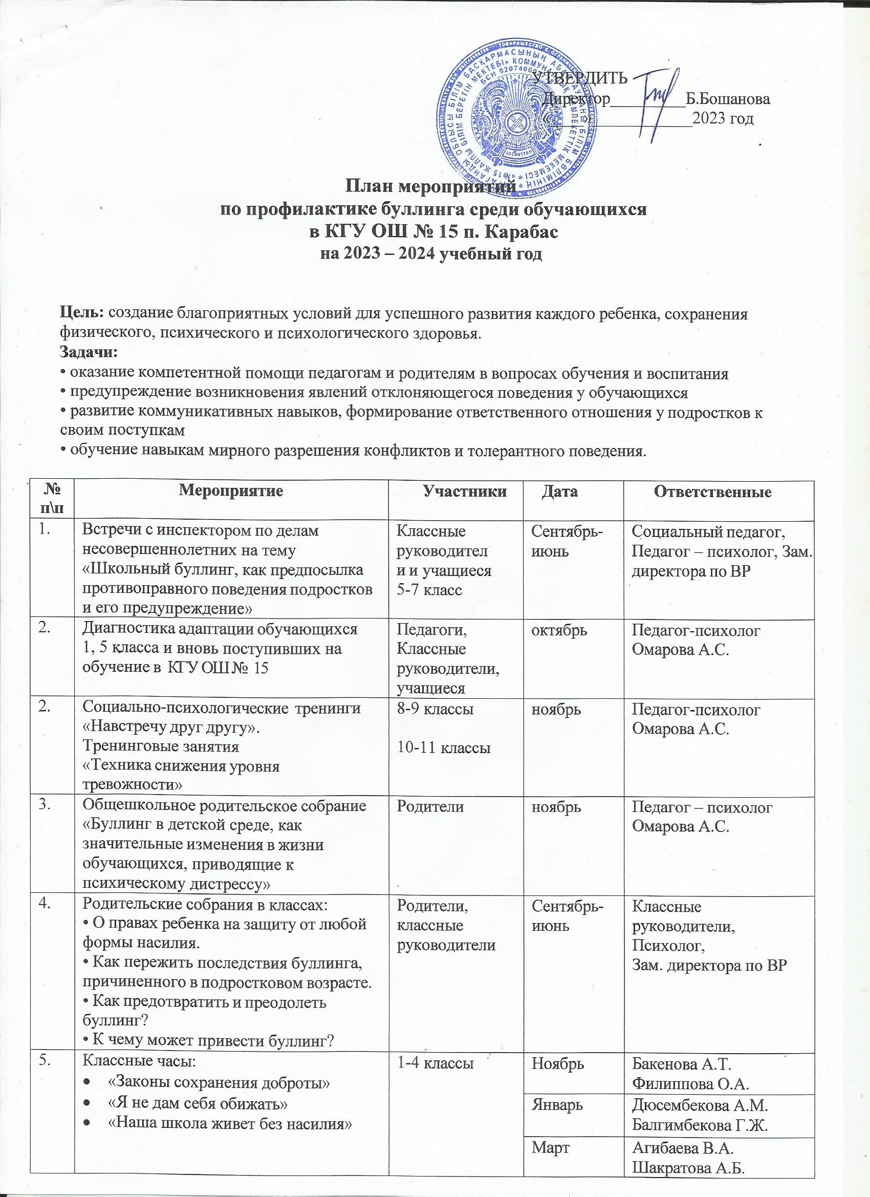 Утвержденный план мероприятий по профилактике буллингаКГУ ОШ 15 на 2023-2024 учебный год |