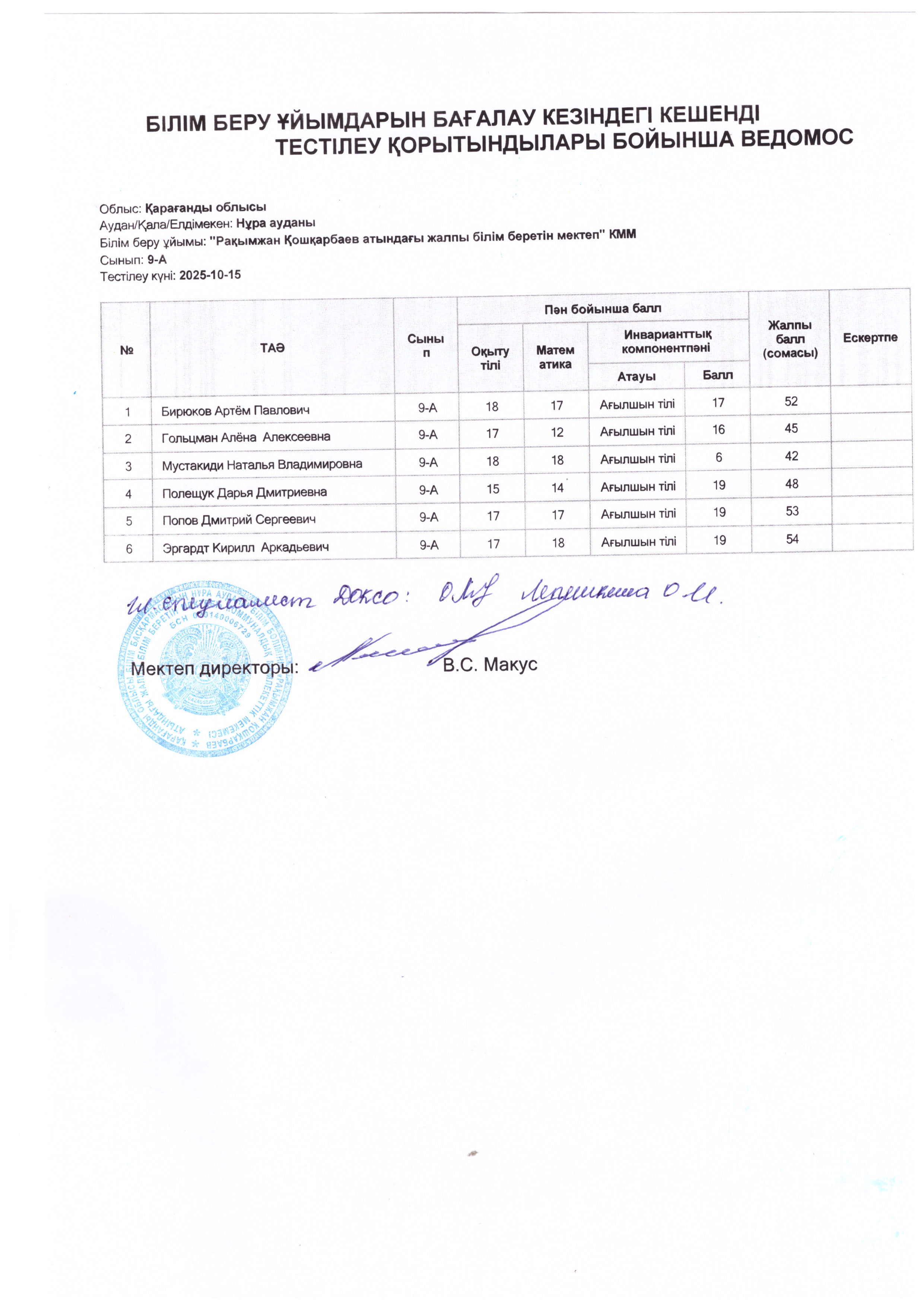 Ведомость по итогам комплексного тестирования при оценке организаций образованияВедомость по итогам комплексного тестирования при оценке организаций образования -9 класс |