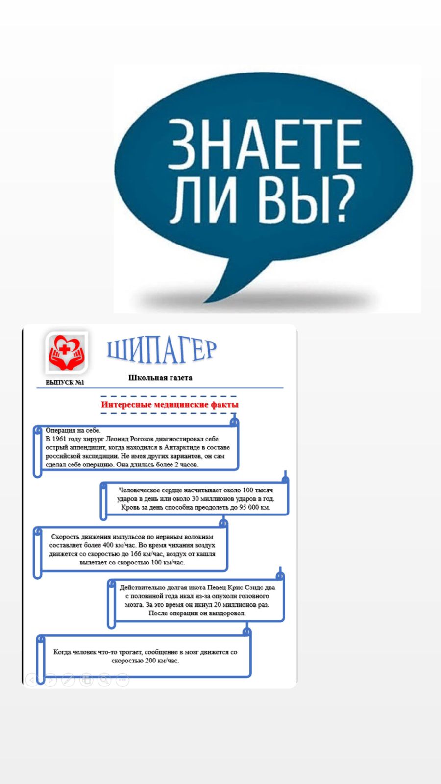 В КГУ «Опорная школа (РЦ) на базе гимназии №9» в рамках проекта «Шаг в медицину» учащимися медицинского класса был создан второй выпуск школьной газеты «ШИПАГЕР». |