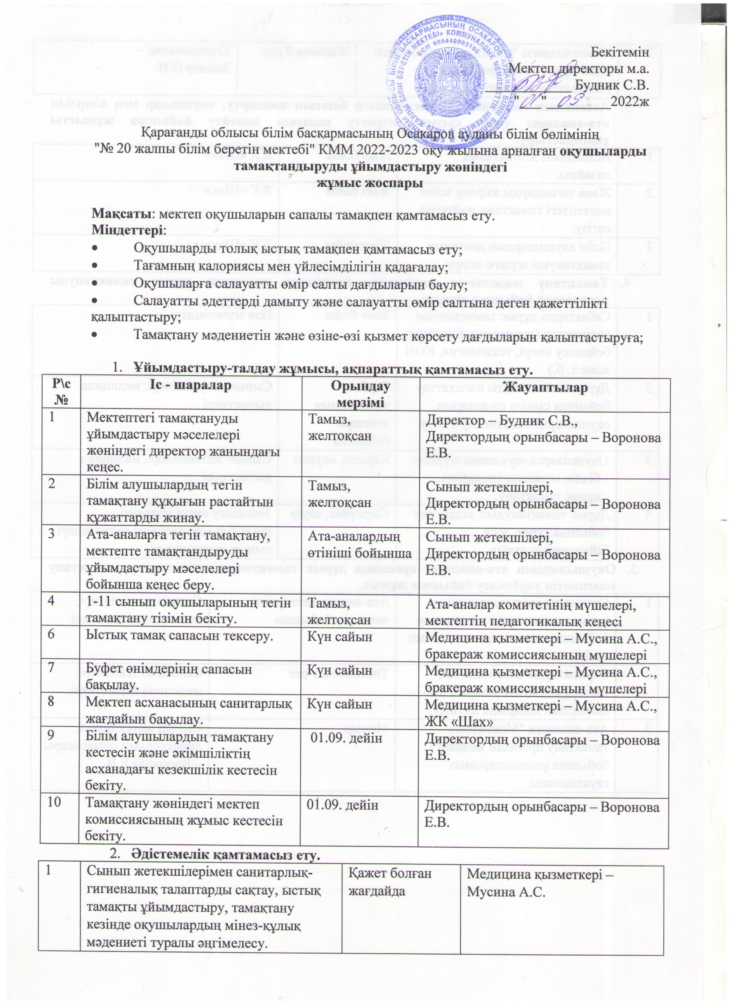 Тамақтануды ұйымдастыру жоспары 1. |