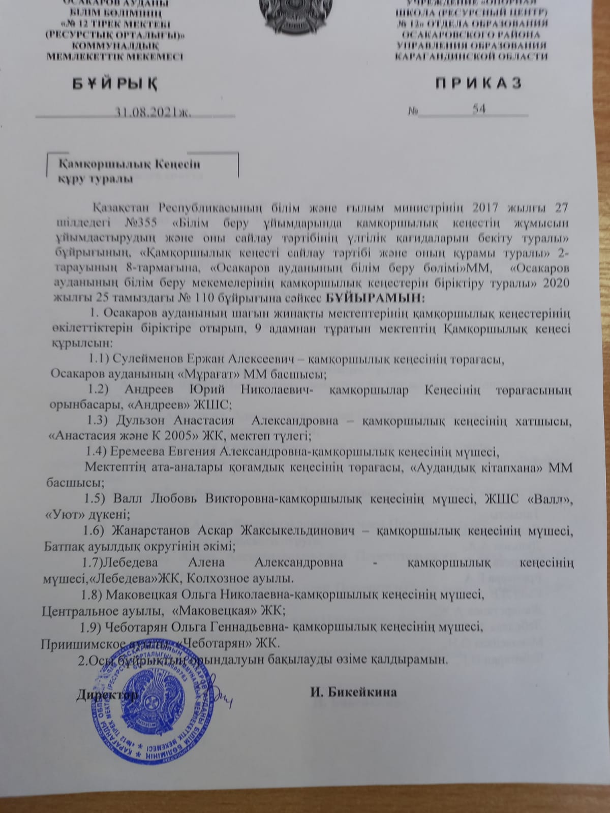 Қамқоршылық кеңесті құру туралы бұйрық