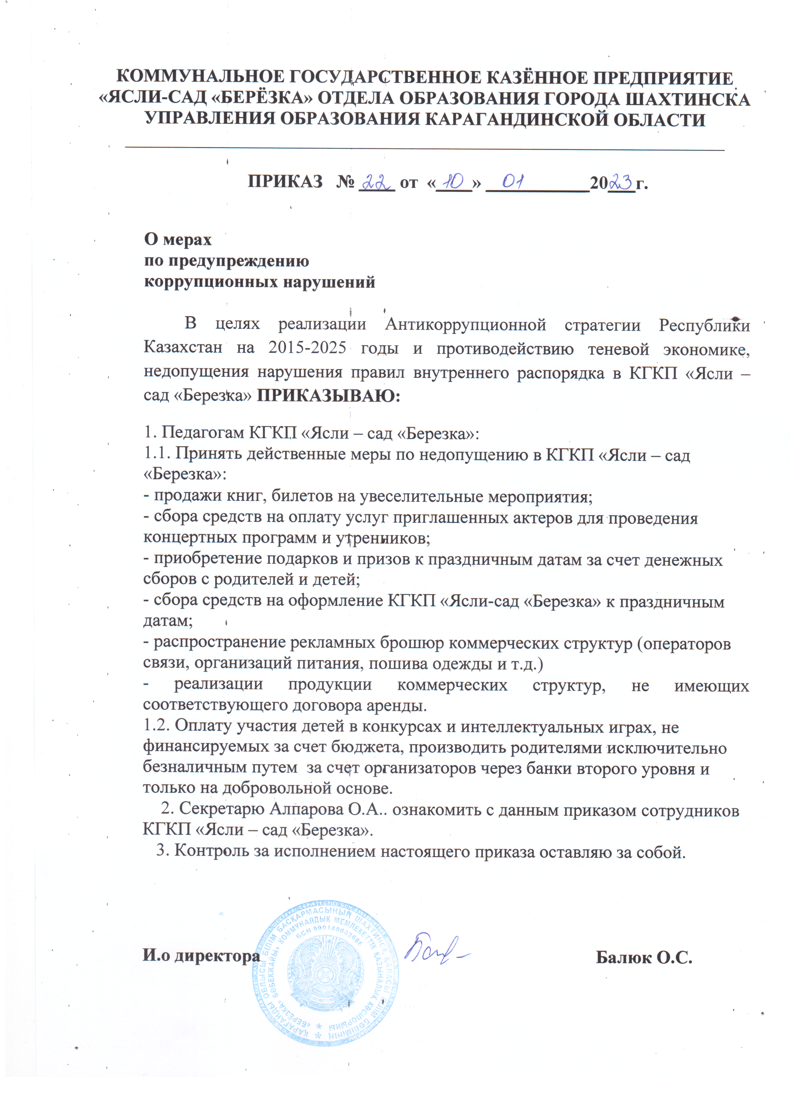 План мероприятий по реализации Антикоррупционной стратегии Республики Казахстан на 2015 – 2025 годы и противодействию теневой экономики в КГКП «Ясли – сад «Березка» на 2022 – 2023 учебный годПлан