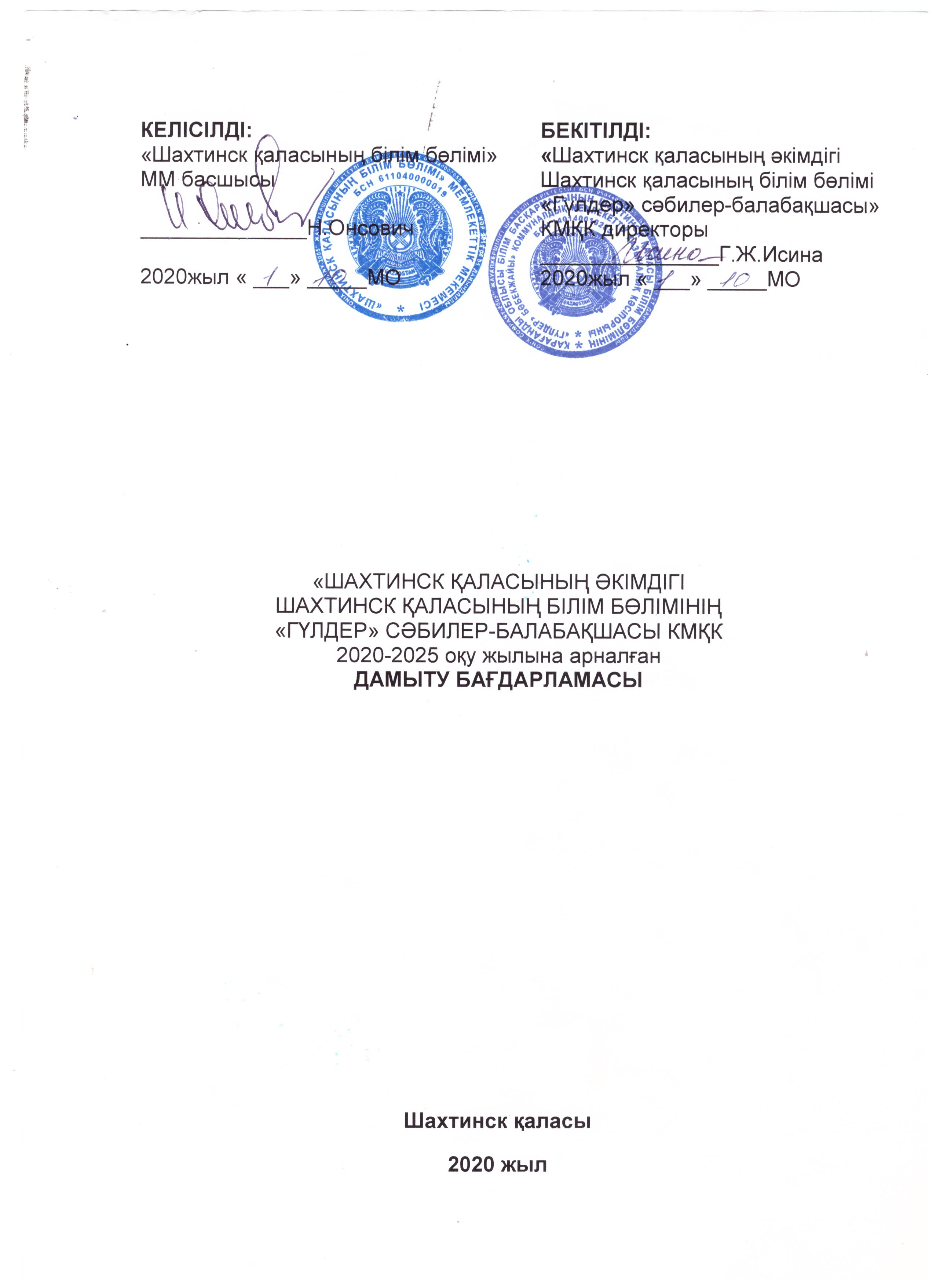 Шахтинск қаласы әкімдігі Шахтинск қаласының білім бөлімінің «Гүлдер» сәбилер-балабақшасы» КМҚК 2020-2025 жылдарға арналған ДАМУ БАҒДАРЛАМАСЫШахтинск қаласы әкімдігі Шахтинск қаласының білім бөлімінің «Гүлдер» сәбилер-балабақшасы» КМҚК