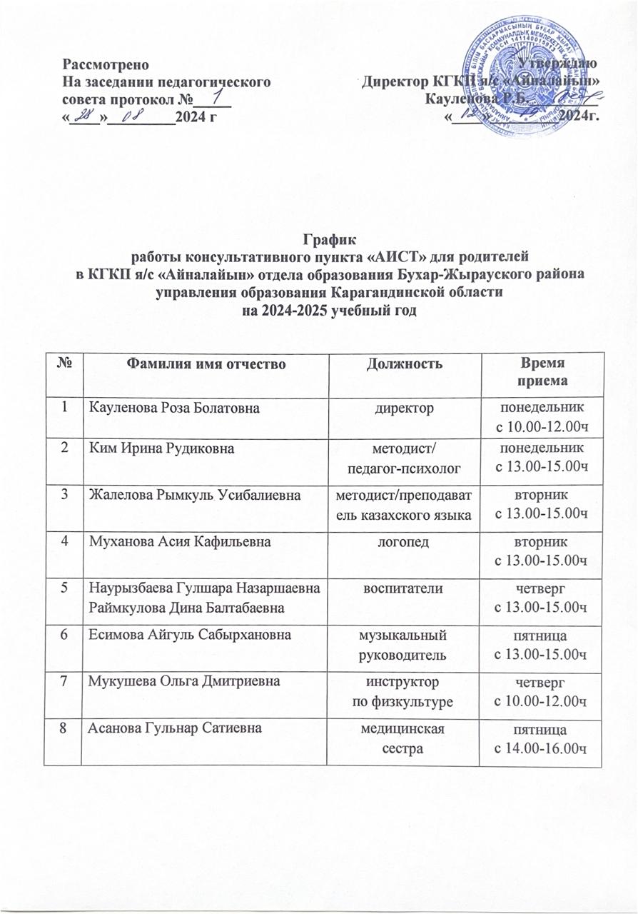 консультативного пункта "АИСТ" для родителей, дети которых не охвачены дошкольным воспитанием и обучением на 2024-2025 учебный год