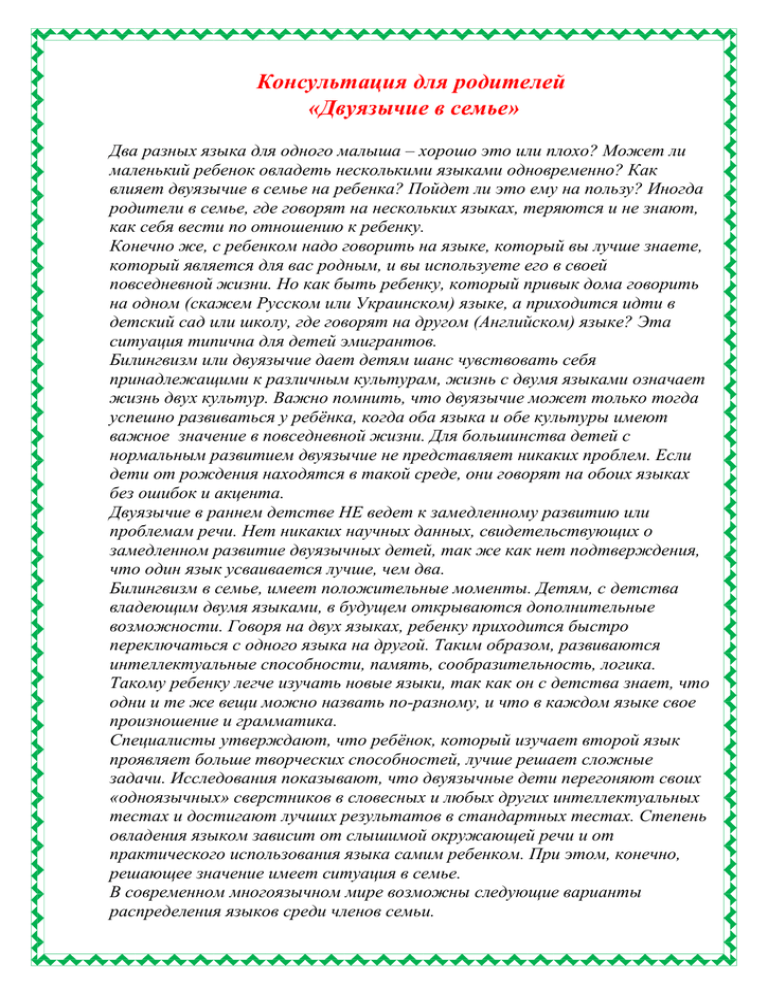 "Двуязычие в семье"Консультация для родителей "Двуязычие в семье» |