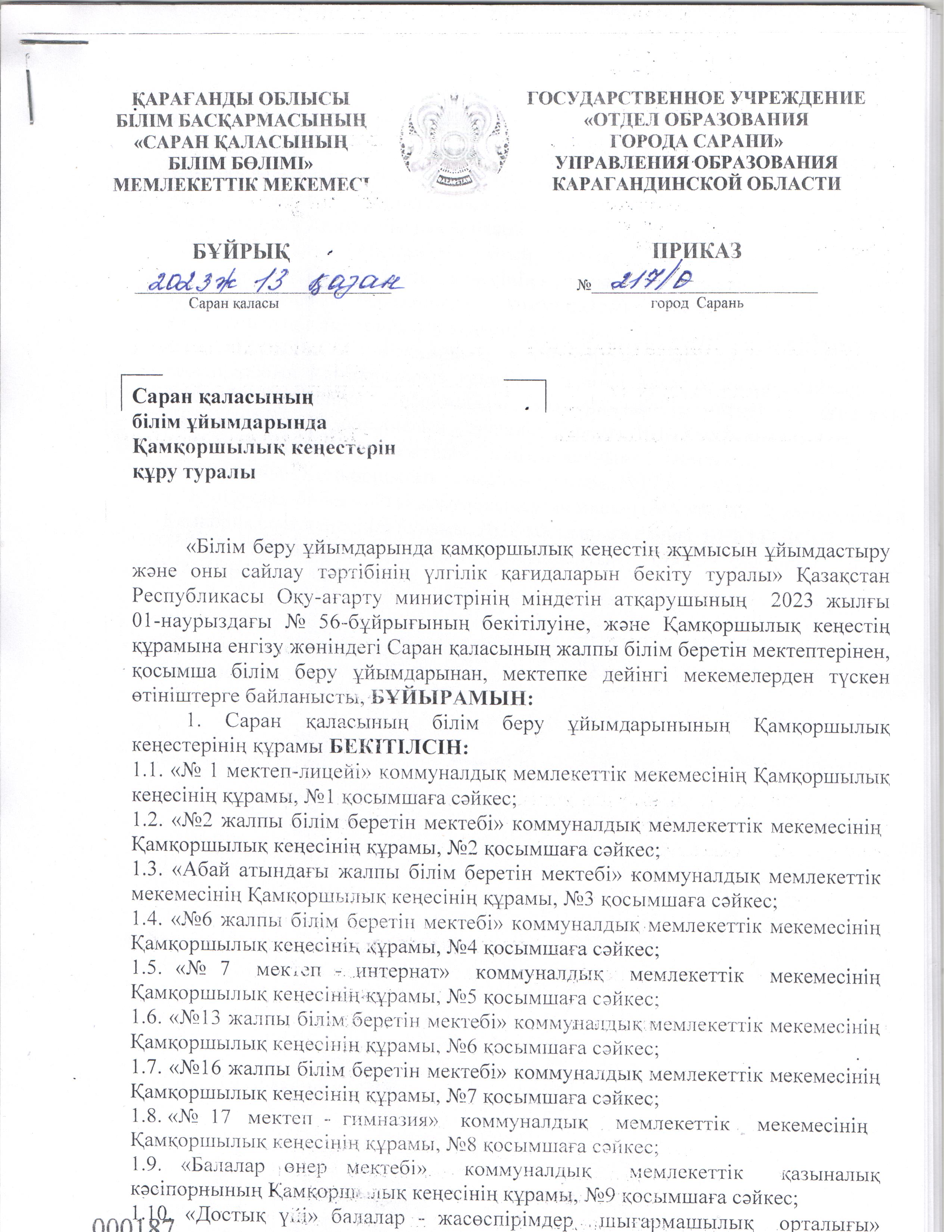 приказ о создани Попечительского совета В КГКП я/с "Березка"